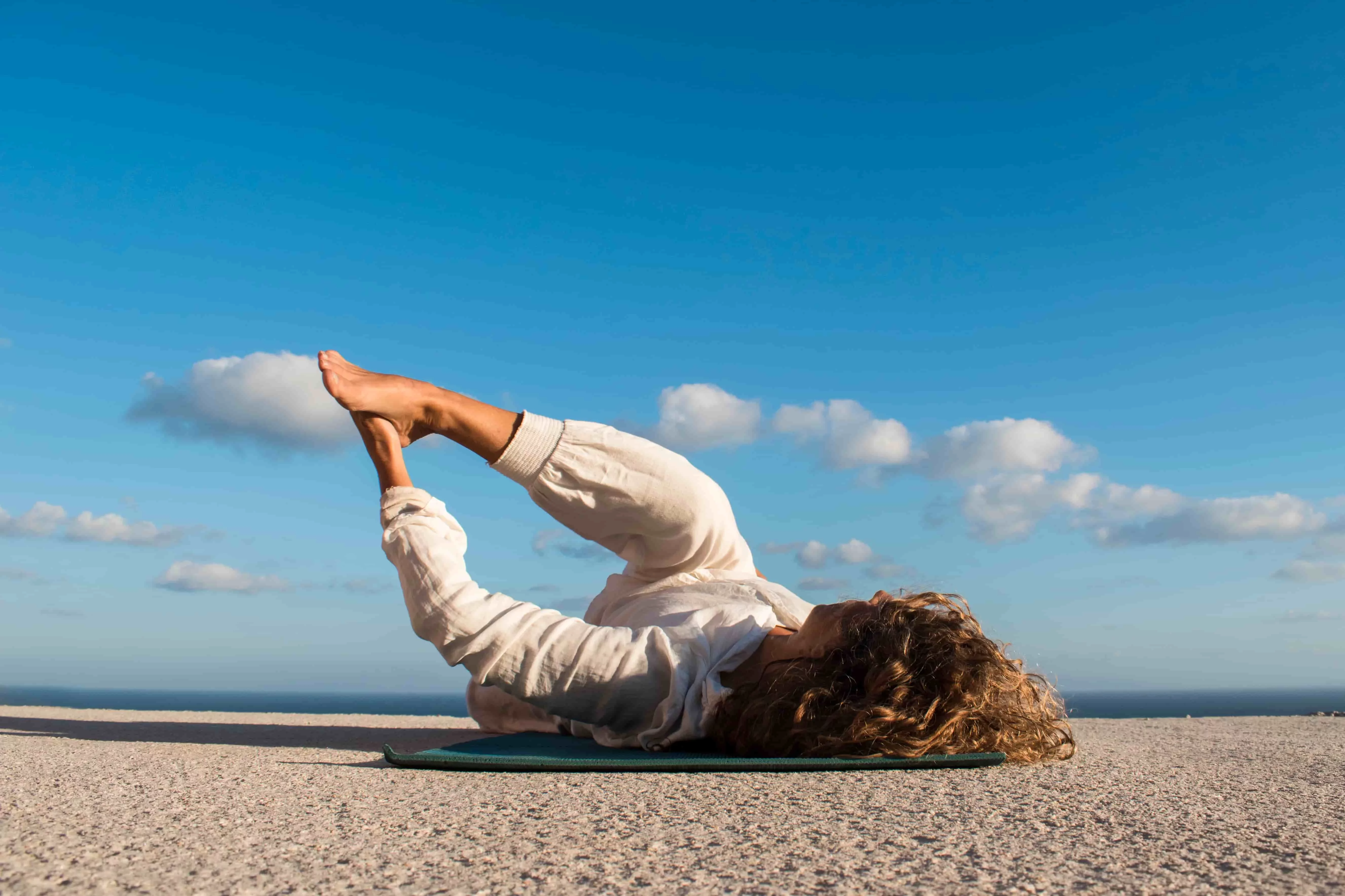 A yoga mat, comfortable warm clothing, socks, a small blanket, and a small pillow.